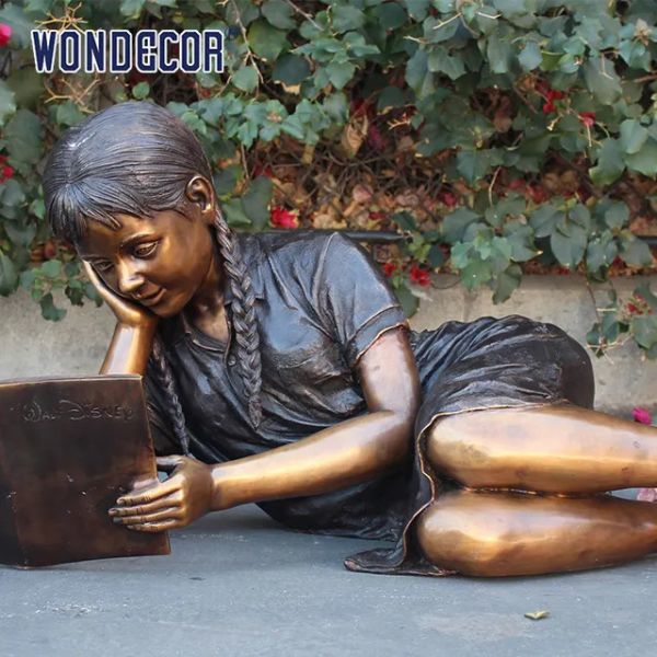 Customized garden decoration, life-size bronze statue of a girl lying on her side reading a book